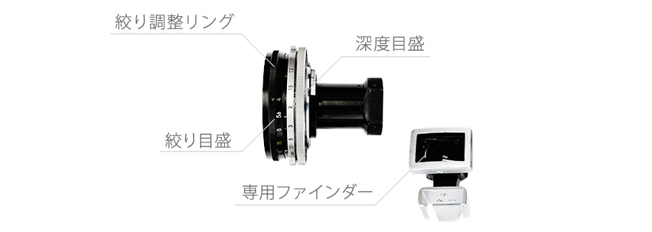 このレンズの一見してわかる特徴は<写真>に示すとおり、マウント面から後ろ(後玉)が突き出ていることです。レンズの後端とフィルム面までの間隔は約7mmしかありません。そのため、ミラーアップできるマニュアルフォーカス一眼レフカメラ、具体的には「Nikon F」、「F2」シリーズ等で使用します。フレーミングは専用ファインダーを「F」、「F2」のアクセサリーシューに装着しておこないます。また、フォーカシングは目測です。