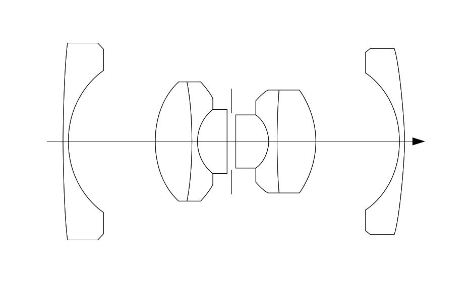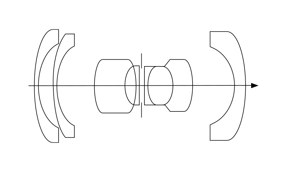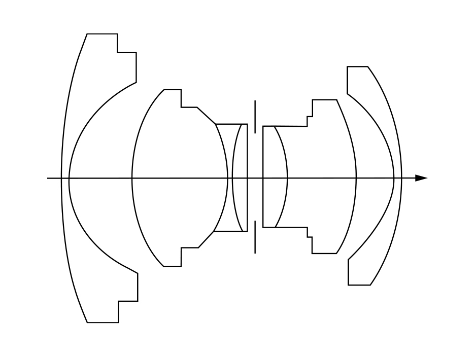 少し難しい話をすると、このレンズの光学系は<図1.>の凹凸凹対称型で、現在一眼レフカメラ用交換レンズでは主流のバックフォーカスの長いレトロフォーカス型広角レンズとはずいぶん異なる構成になっています。基本的に凹凸凹対称型レンズの構成は、“ビオゴン(Biogon)”タイプ<図2.>が歴史的に先行し、いまなお有名ですが、同じく凹凸凹対称型のレンズ構成を持つ「NIKKOR-O 2.1cm F4」は、日本光学工業(現・ニコン)の名設計者・脇本善司(わきもとぜんじ)氏の発明によるものです。脇本氏はS用・F用のニッコールレンズの開発者のひとりで、マイクロニッコールレンズ(精密複写用レンズ)の生みの親でもありました。さらにはウルトラマイクロニッコールレンズ(IC、LSIの露光装置用投影レンズ)を開発、この業績で氏は、天皇陛下より紫綬褒章(しじゅほうしょう)を賜っております。