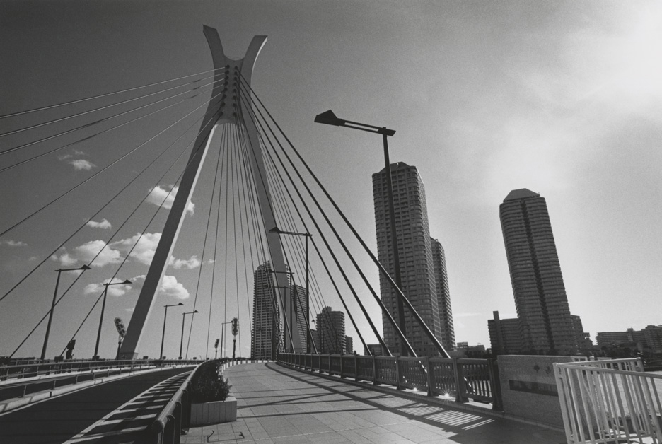 話が前後しますが、対称型広角レンズの特徴として、1.)ディストーション(歪曲収差)が少ない点と、2.)周辺減光が大きい点が挙げられます。2.)の周辺減光は絞り込むか、プリント時に覆い焼きするなどして対応することになりますが、1.)のディストーションは像そのものの歪みに関わることなので修正することは困難です。ディストーションの有無はできあがった写真の印象を大きく変えます。たとえば風景写真などではディストーションの少ない広角レンズで撮った場合、奥行き方向に写り込みが少ない山や水平線などの写真は、その素直な描写ゆえにどのくらいの画角のレンズで写したのか、分からなくなることさえあります。言い換えればそれだけ自然な描写が得られるといえるでしょう。