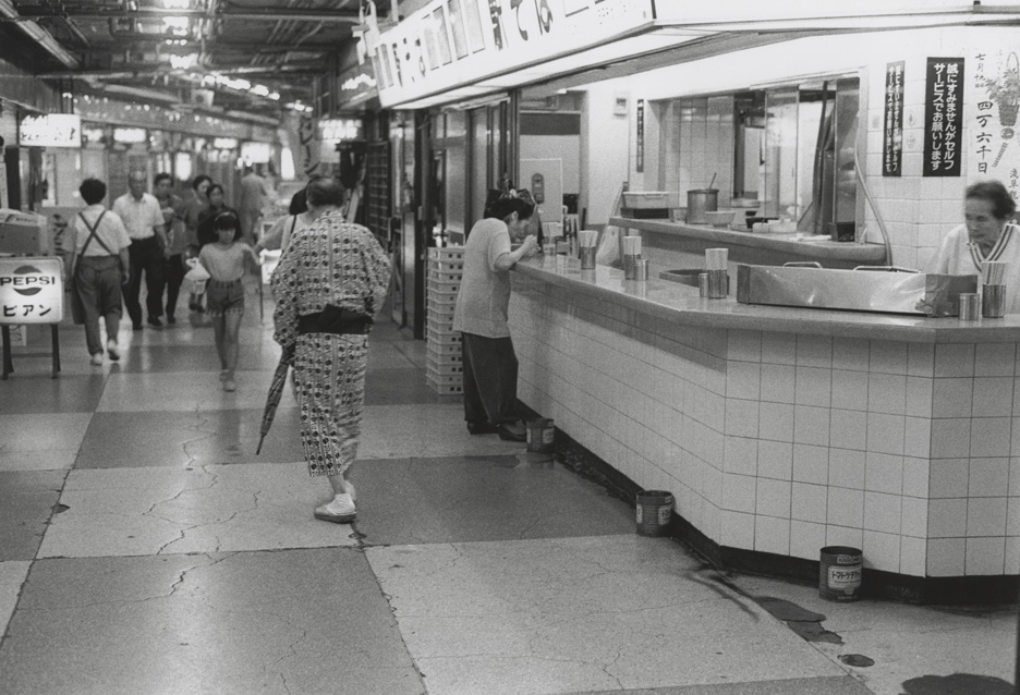 f/2.8~4の描写は解像力、コントラストともに、より向上します。特に画面中央部分は非常にシャープになります。しかしながら、柔らかさは失われません。周辺光量も改善され、問題の無いレベルになります。<作例1.>写真では浴衣の男性の足元、床、タイル等にピント面があります(シャッタースピードが遅く、部分的に被写体が動いていますがご容赦ください)。また、背景のボケ味も良好で、点光源が著しく変形していないことがわかります。室内や夜のスナップ、ポートレートにはf/2.8~4ぐらいの描写が適していると思います。