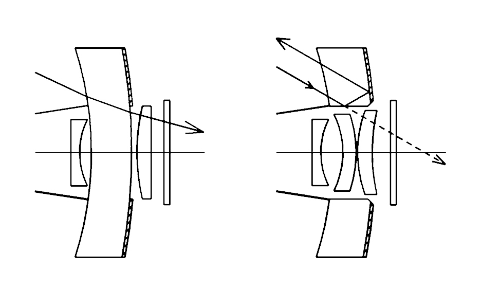 「<New>Reflex-Nikkor 500mm F8」は、鏡筒の中に遮光のための立派な内蔵フードが 2つもついています。これらは迷光やゴースト・フレアの発生を抑制する工夫です。また、レフレックスレンズの主鏡には、図2.と図3.のようにふたつの設計的な解がありますが、図で明らかなように、図3.の解の方が優れています。図2.の案では、迷光がフィルム面に直接降り注ぎ、そのフレアによって画質を低下させる可能性が高いのです。しかし、主鏡の中心に精度良く大きな孔をあける作業はとても大変です。「良いものを作りたい!」という一心で、綱嶋さんは製造や品質管理部門に異動までされて奮闘・注力なさったのです。