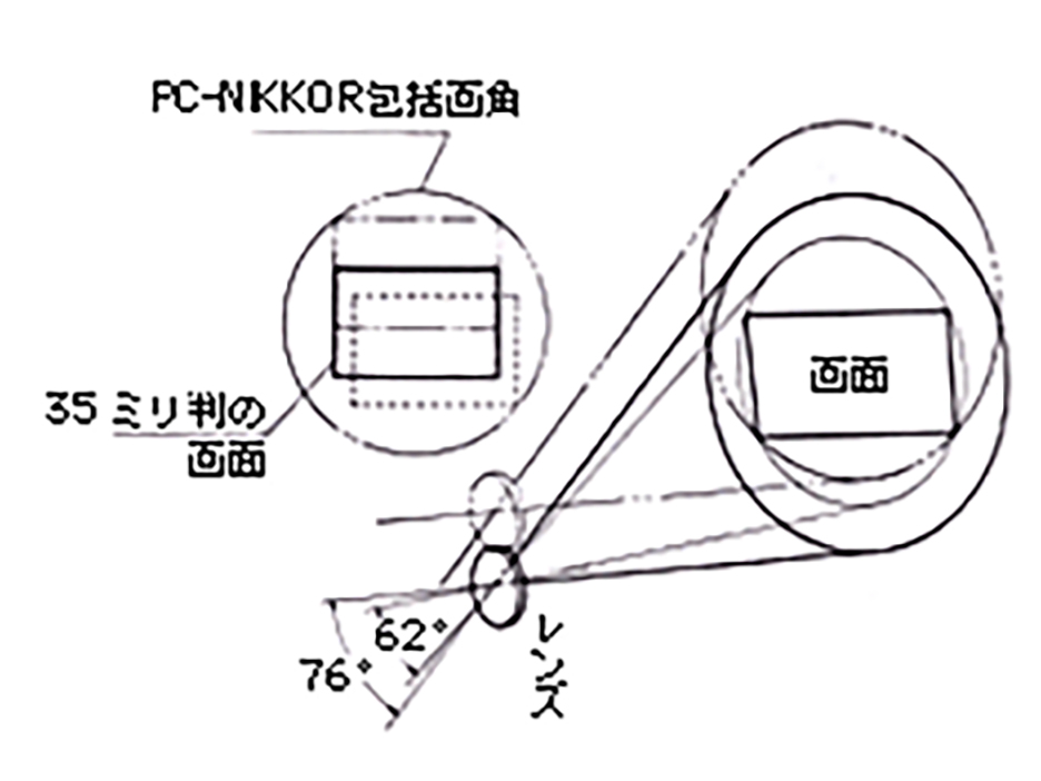 PC-ニッコールの焦点距離は室内撮影や高層建築の撮影なども考慮して35ミリにとりました。普通の焦点距離35ミリレンズは、35ミリ判の対角線画角が62度ですが、このレンズでは設計上の画角がもっと大きく76度にとってあります。そのために包括する画角は35ミリ判よりずっと広いわけで言いかえれば、PC-ニッコールではレンズをあおるということは、第1図のように広い画面の中で35ミリ判の大きさの画面をあちこちに移動させて、好きな構図を選んでいることになります。したがってフィルム面を被写体と平行に保てば、被写体の変形描写を防ぐことができるわけです。
