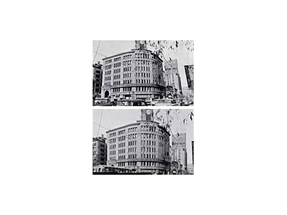 PC-ニッコールを用いると、カメラを向けかえないで被写体の撮影範囲を変えることができるわけです。たとえば高い建物を地上から斜撮影すると、作例1のように上つぼまりになります。同じ位置でPC-ニッコールを上にあおって撮影すると作例1下のように縦の線が全部垂直になって歪みなく撮せます。