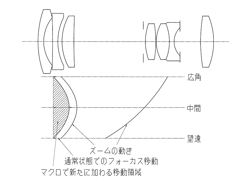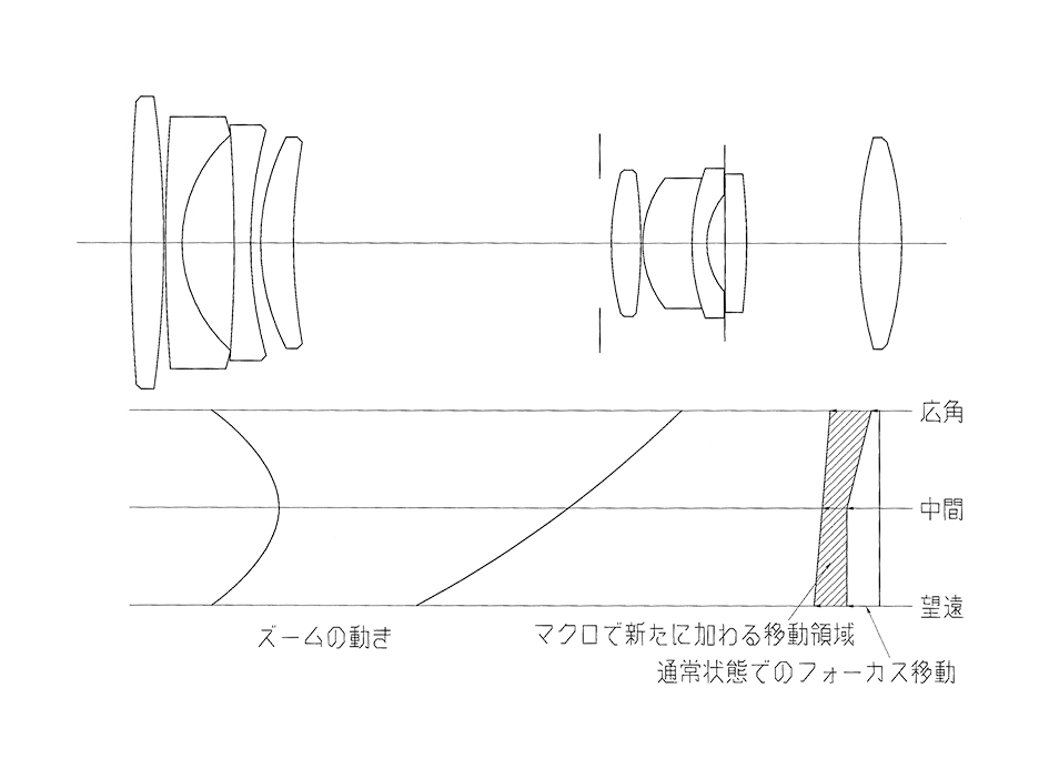 この3群によるピント合わせは、望遠側に比べ、広角側ではわずかなレンズの移動で近距離にピントが合うという性質がある。そのため3群はステッピングモーターによる電子カムによって移動するが、そこで、広角側で「余った」3群の移動量をめいっぱい使ってピント合わせするようにして、レンズ前4cmというマクロ撮影を可能にしているのである。