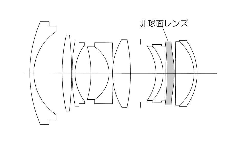 図1は28mm F1.4レンズの構成図である。このレンズの特徴は、絞りの直前に配置された曲率の強い両凸レンズと、一見してそれとわかる「非球面度」の強い非球面レンズだろう。また難しい収差の話で申し訳ないが、最初に説明したサジタルコマフレアは、曲率が強い凹面で発生すると考えられており、そのため前群に凹レンズを多数配置する広角レンズではサジタルコマフレアの補正が困難なのであった。そこでこのレンズでは、各凹レンズの曲率をできるだけ弱めるとともに、曲率の強い凸レンズと非球面レンズを配置して、巧みにサジタルコマフレアを補正している。
