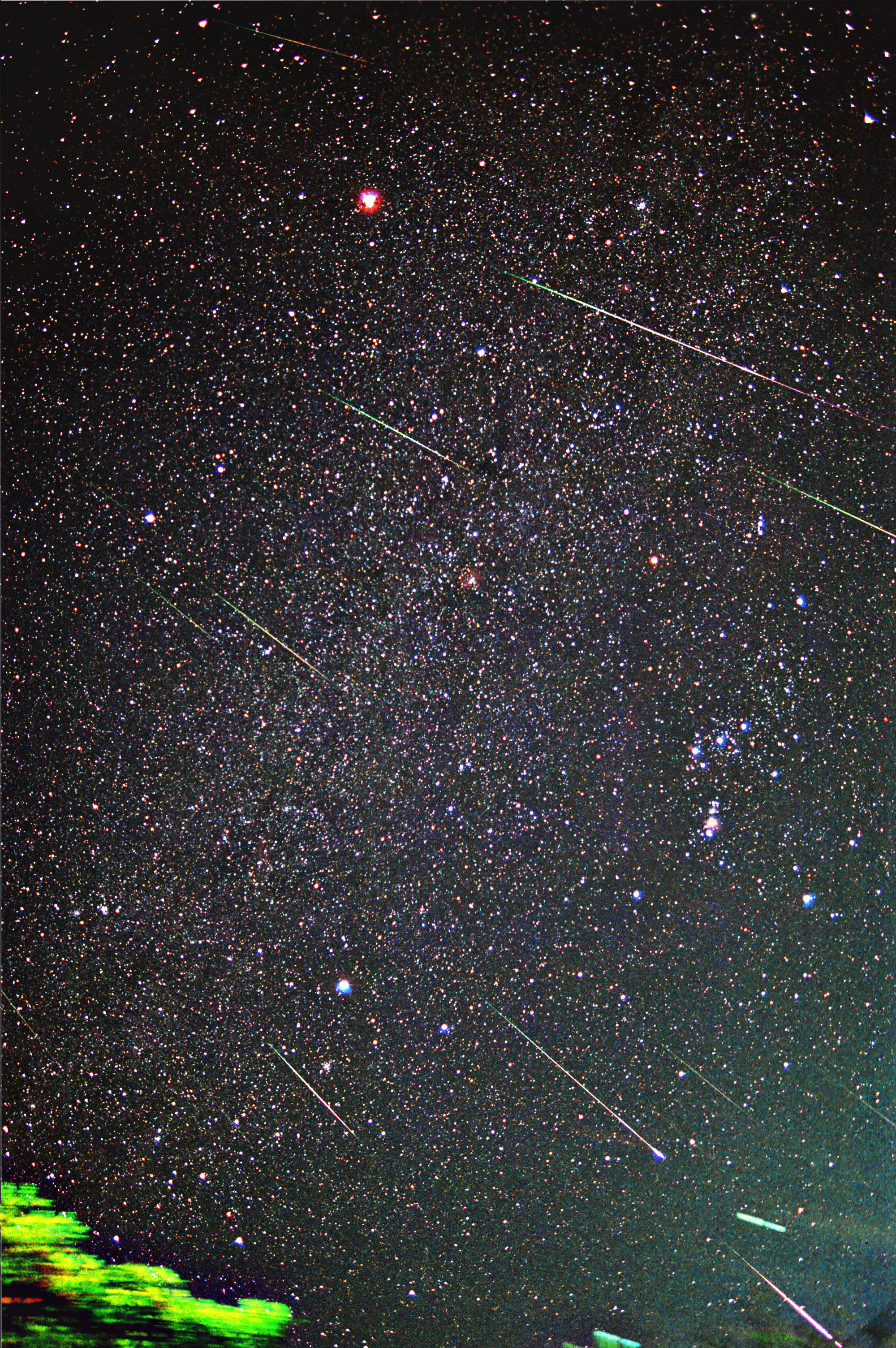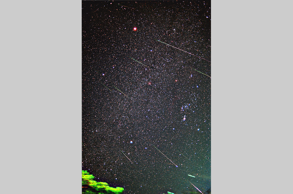 作例1は、新聞やTVなどでも話題になった2001年のしし座流星群の写真である。普通の星なら、赤道儀という星の日周運動を追尾する装置にとりつけ、長時間露出で星の光を蓄積することによって、肉眼では見えないような暗い星まで写すことができるが、流星の光っている時間は非常に短い時間のため、高感度フィルムと、大口径レンズがどうしても必要となる。しかも流星はいつどこに流れるか予想がつかないため、構図の中に流星を収めるためには出来るだけ広い画角のレンズが有利である。28mmの広い画角と、F1.4の明るさを兼ね備えたこのレンズはまさに流星を撮るために生まれてきたようなレンズである。作例1は絞り開放で撮影した。周辺の明るい星でわずかにサジタルコマフレアによる青白い光芒が見られるが、ほとんど目立たないことがおわかりいただけるだろう。ただ、星の写真を絞り開放で撮影すると周辺減光が目立つ場合がある。流星写真以外では1~2絞り絞り込んで撮影した方がよい結果が得られる。この作例ではネガフィルムをスキャナーで取り込み、コントラストを上げ、周辺光量も補正している。