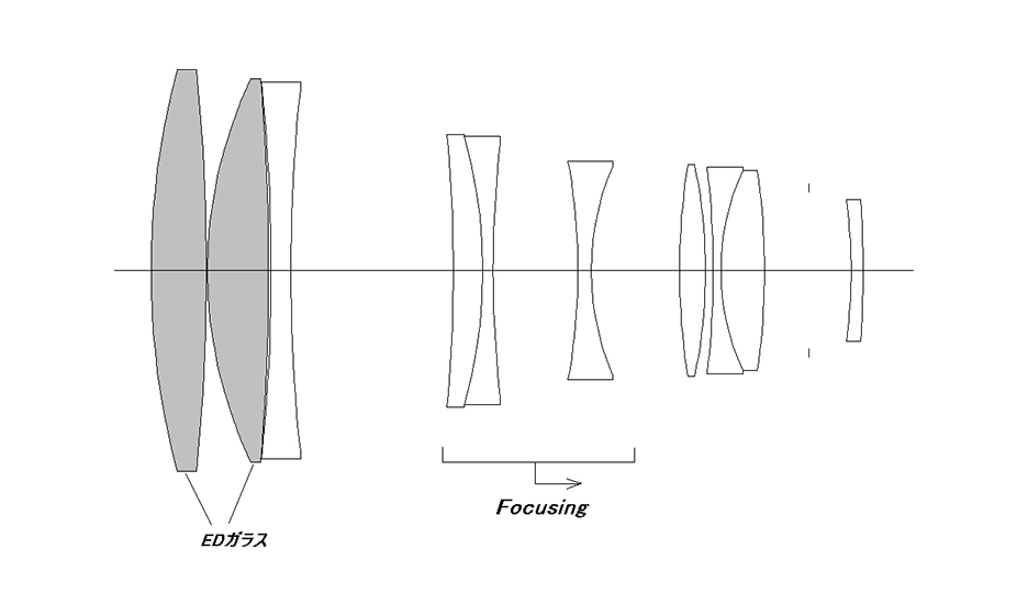 まずは断面図をご覧ください。前の2枚はEDガラスです。そして、その2枚のEDガラスを含む前群の3枚が、望遠レンズとしての最も重要な前群を構成しています。設計的には、この3枚で、十分に色収差と球面収差、下方コマ収差の補正を行なう必要があります。次に3枚のレンズで構成された凹群の合焦群が続きます。この凹群でテレ比をかけると同時に、合焦機能を持たせることが、林氏の発明の重要な部分です。この凹のパワーを強めれば強めるほど、前群の残存収差が拡大され、また近距離収差変動も増加します。