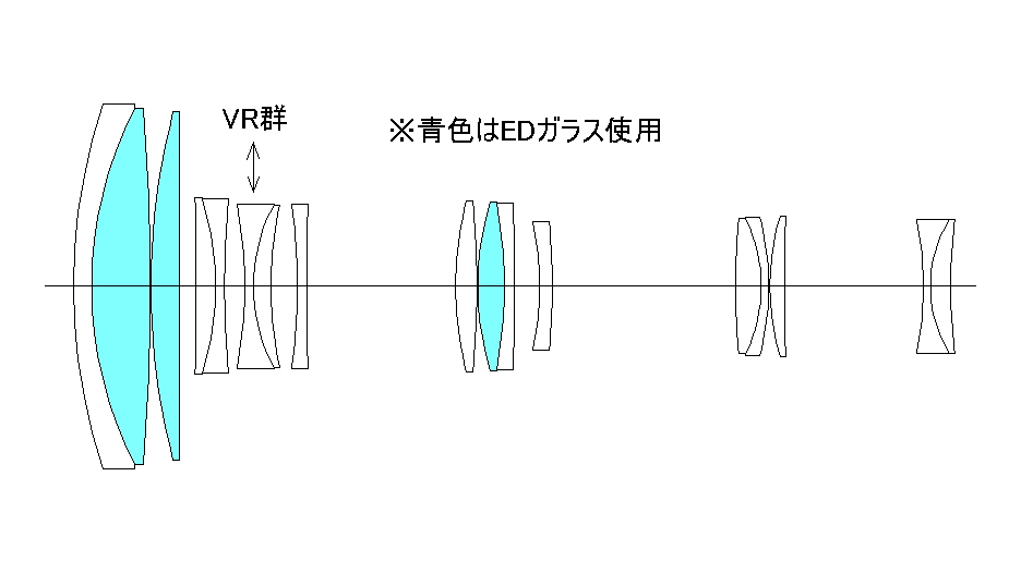 VR群は基本的に主光線が光軸近傍を通過する部分を用いる方法が、VR起動時非点収差や偏芯コマ収差の発生が少なくなるのです。その点、このレンズは広角側でも望遠側でも適した構成になっています。したがって、このレンズはVR起動時の性能劣化が極めて少なく、安定した光学性能を実現しているのです。また、1群に2枚、3群に1枚、合計3枚のEDガラスを使っています。1群のEDガラスは広角側では倍率色収差の補正に効果を発揮し、望遠側では軸上色収差の補正に絶大な効果をもたらします。また、3群のEDガラスは主に広角側の軸上色収差の補正に効果を発揮しています。