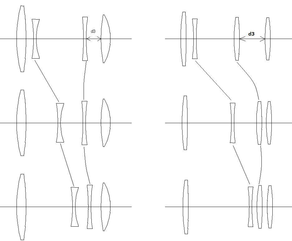 図2は正負負正(凸凹凹凸)山路タイプのズームレンズの模式図です。図3は中村氏の正負正正(凸凹凸凸)アフォーカルズームタイプの模式図です。両方とも左から、フォーカス群、バリエータ群、コンペンセータ群、マスターレンズ群です。バリエータが大きく動くことで変倍し、そのピント移動をコンペンセータが補償します。一目でわかることは、ズーム比が大きければ大きいほど、レンズの移動距離が必要となり大型化すると言うことです。ここで注目したいところはコンペンセータの移動軌跡です。アフォーカルズームは像面(右側)に対して凸面を向くように移動し、山路タイプは像面に対して凹面を向くように移動します。したがって、山路タイプ(図2)はアフォーカルズームタイプ(図3)よりも図の「d3」間隔が少なくできるのです。ここに小型化の可能性があるのです。しかし、その理屈には大きな落とし穴がありました。山路タイプはバリエータとコンペンセータを凹凹と重ねて配置するため、結像に導くにはその直後に大きな凸のパワーを配置させ、光線を大きく曲げる必要があります。したがって、マスターレンズの凸の構成をおごる必要があったのです。せっかく全長を短くできる可能性があったのですが、一長一短で必ずしも山路タイプが小型になるとは言えませんでした。しかし、最も可能性を秘めた特徴は、バリエータとコンペンセータが共に凹群と言うことにつきます。要は変倍部の凹のパワー強めることができるのです。この特徴はペッツヴァール和の最適化にも貢献します。また、察しの良い方はここでピーンと来たのではないですか。そうです、このレンズタイプは広角化に向いているのです。Aiズームニッコール50~135mm F3.5Sでは、広角端を50mmまで短くすることができた秘密はここにありました。しかしながら、更なる広角化は凹先行ズームや第1凸群移動タイプのズームレンズに道を譲らなければなりません。35mm判のズームレンズであまり見かけないレンズタイプになった理由は、第1群移動の凸先行ズームレンズタイプの発明によるものだと思います。しかし、山路タイプは、著しい高倍率化と全長固定が必要なテレビカメラの世界で花開きます。現在では動画用(業務用)高倍率ズームレンズの大部分がこの山路タイプで構成されています。動画用レンズではとてもスタンダードなレンズタイプになっているのです。