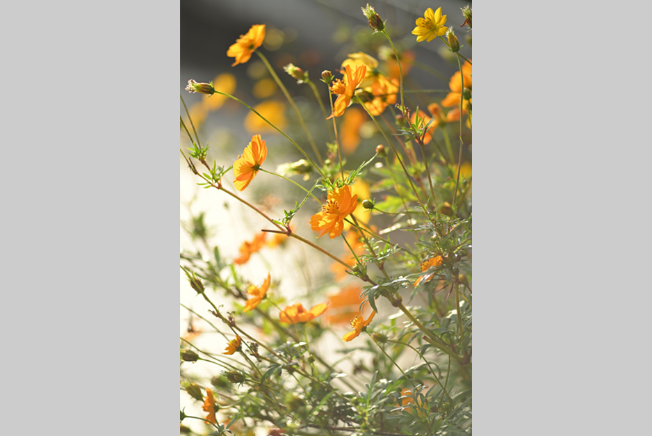 作例5は、このレンズの最至近、開放で撮影したキバナコスモスである。太陽が画面のすぐ上にある逆光状態の写真だが、内蔵フードが役に立ってくれた。このような逆光の写真では、被写体をとりまくフレアや、ぼけのエッジの色づきがよくわかる。拡大すると、前ボケはリング状になっており、ぼけの輪郭が赤紫色に、後ボケは、ぼけ中心に明るい芯を残しながら、少し黄緑がかったフレアがとりまいていることがわかる。