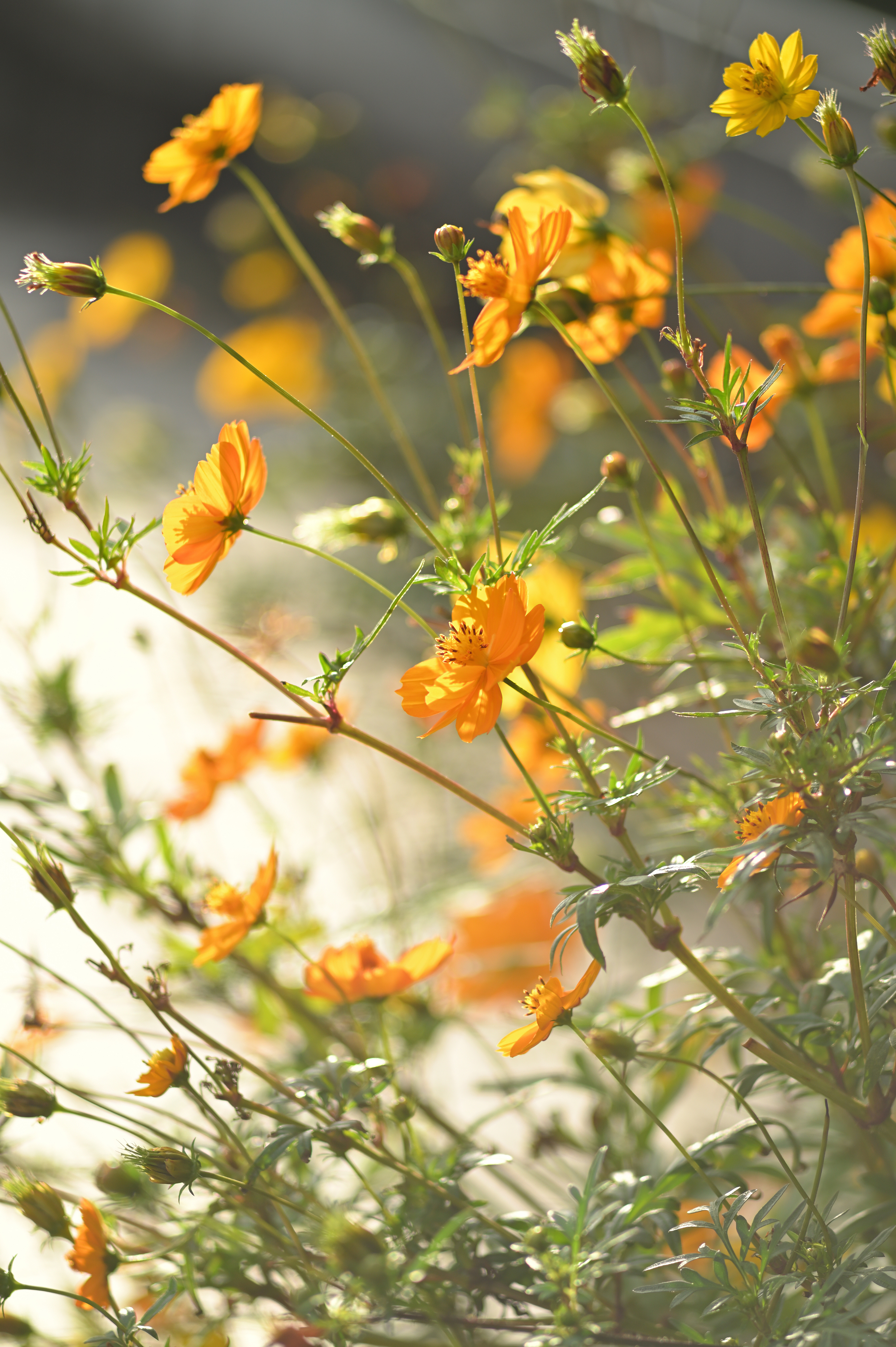 作例5は、このレンズの最至近、開放で撮影したキバナコスモスである。太陽が画面のすぐ上にある逆光状態の写真だが、内蔵フードが役に立ってくれた。このような逆光の写真では、被写体をとりまくフレアや、ぼけのエッジの色づきがよくわかる。拡大すると、前ボケはリング状になっており、ぼけの輪郭が赤紫色に、後ボケは、ぼけ中心に明るい芯を残しながら、少し黄緑がかったフレアがとりまいていることがわかる。