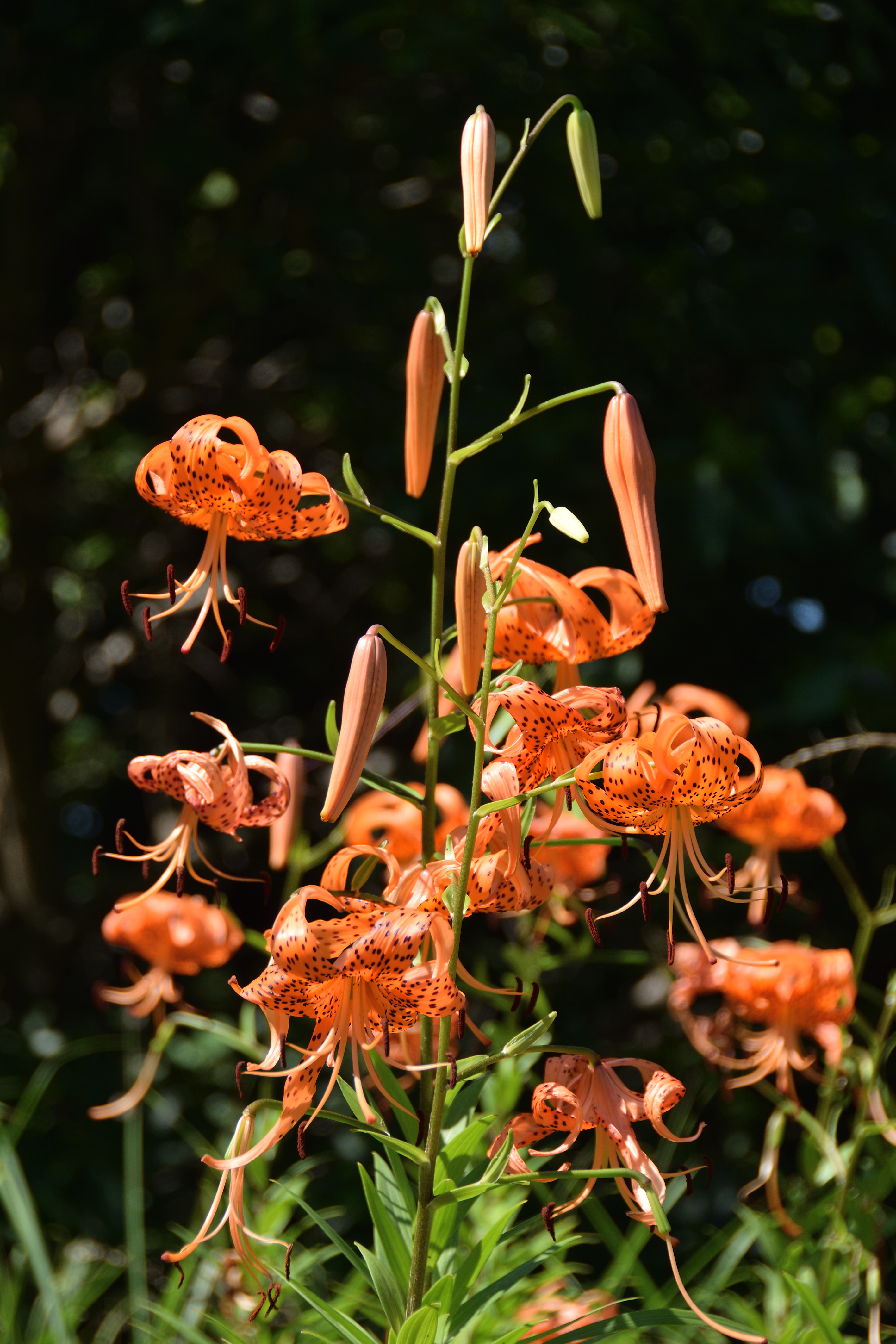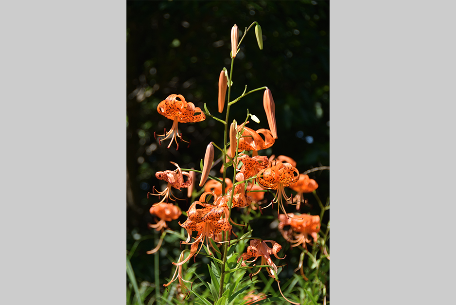 作例6は、焦点距離95mm、絞りF5.3で撮影したオニユリの花である。100mm前後の焦点距離では、またコマ収差が目立つようになるため、また画面右下の花や画面上部のつぼみなどが少しフレアがかっている。100m前後は最も軸上色収差や倍率色収差が小さく抑えられているため、色づきは感じられない。