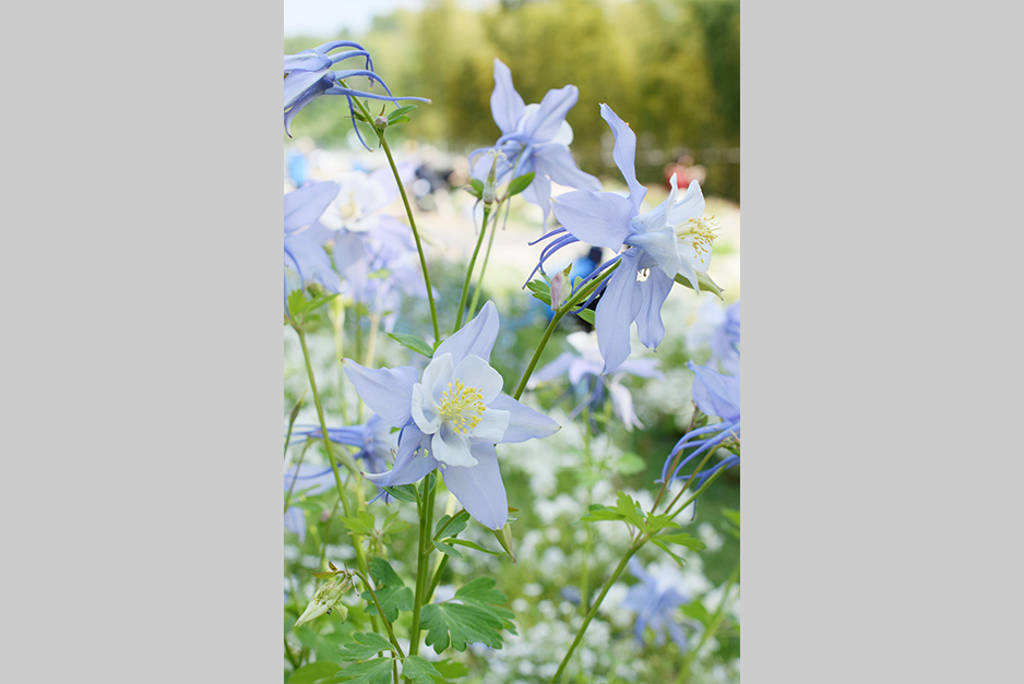 作例6は、さらに寄って撮影したオダマキの花である。オダマキの花の不思議な立体的な姿を映すため、絞りF8に絞り込んで撮影している。オダマキの花は派手なので、見た目は大きく見えるが直径数センチしかない。かなり寄って撮影しているため、F8に絞り込んでも、背景は大きくボケている。