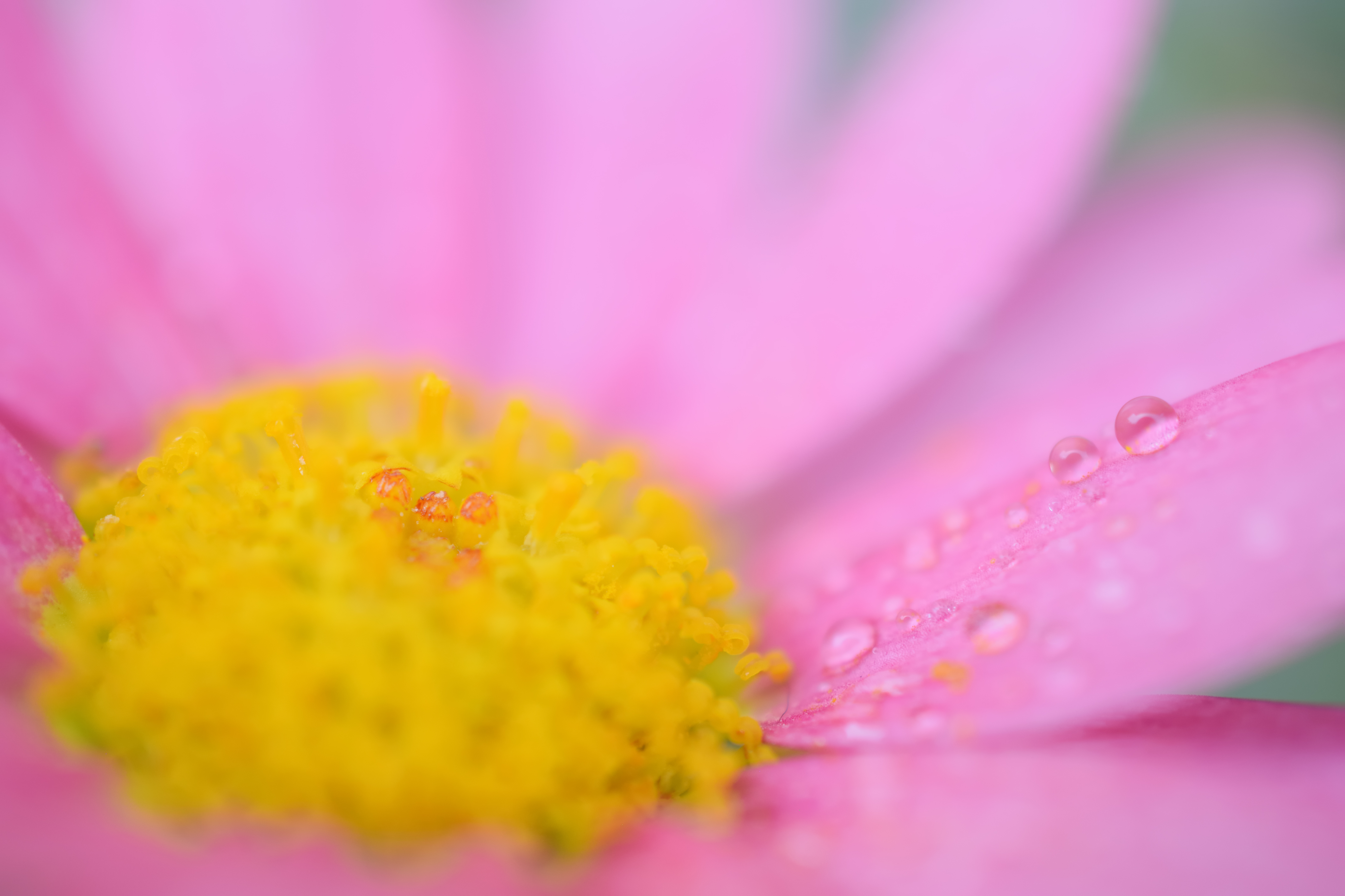マイクロ域の撮影でこのレンズのチャームポイントは、その明るさと性能の高さである。第七十四夜で紹介したAI AF Micro Nikkor 60mm F2.8Sでは、等倍時の実効FナンバーはF5だったが、このレンズはF4.2と半絞りも明るいのである。そして、それまでのマイクロレンズが、近距離になるにしたがって球面収差が増大し、性能が暫時低下していったのに対して、このレンズは軸上色収差が増大するものの、球面収差が等倍までほとんど変化しないため、等倍絞り開放でも高い性能をもっているのである。この作例8でも、花の中心にある管状花の様子や、花びらに載った水滴の様子が克明に描写されている。