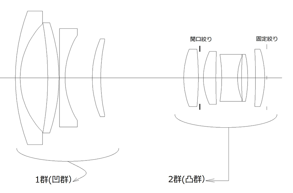 それでは第1群、第2群それぞれの構成を少し見ておきましょう。第1群は凹凸凹凸4枚構成で、25-50mmと同様の構成にしました。広角超広角ズームレンズの1群の基本タイプは大きく分けて凸先行の凸凹凹凸構成と凹先行の凹凸凹凸構成の2タイプあります。この2タイプにはそれぞれ一長一短の特徴があります。私はフィルターサイズを極力抑えてダウンサイジングさせたかったので、中村さんが得意とした凹先行タイプを選択しました。もっと詳しく知りたい方は、是非 ニッコール千夜一夜物語第五十五夜の「5,前玉の秘密」 を読み返してください。さらに詳しく説明してあります。
