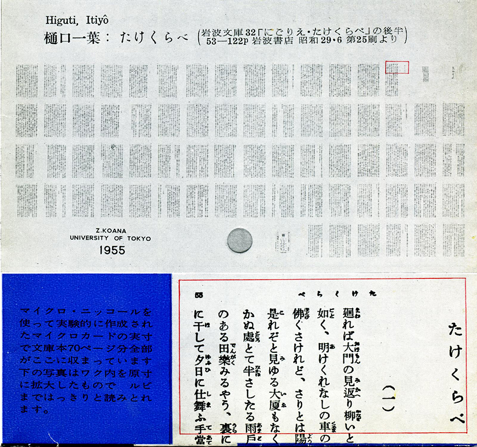 第25/26/85夜でお話しましたように、マイクロニッコール誕生は東京大学教授の小穴純博士と日本光学(現ニコン)の東秀夫氏、脇本善司氏との出会いで生まれました。小穴教授と東氏は大学の同窓、脇本氏には恩師にあたります。そして、数台の試作品が完成します。その試作品の銘版には「R Nikkor 5cm F3.5」と記されていました。この「R」とはどういう意味だったのでしょうか。そのRはReproduction(複写)を意味すると言われています。正式に発表されたかは不明ですが、光学設計書(光学設計報告書)には確かに「複写用 1/1x~1/6x」の手書きの記載がありましたので、その記載が証拠でReproduction(複写)のRという説は十中八九正しいと思います。小穴教授の試験結果が満足いくのであれば、華々しくもRの文字を冠して登場することが決まったはずでした。しかし、先に開発されていたレントゲン(Roentgen)撮影用レンズと間違えられる可能性があるとの指摘から、実際に発売されたレンズの名称はMicro-NIKKORであったと言われています。それでは開発はいつから始まったのでしょうか。試作簿によると、試作開始/試作図面発行日が昭和27(1952)年4月22日と記載されていました。当然のことながら、図面は設計完了後に作成するものです。したがって、小穴教授と東氏、脇本氏が構想を練り始めたのは、遅くとも昭和25,26年頃からではなかったのかと思われます。確かに小穴教授の超マイクロ写真についての研究記録は昭和27年から始まっています。Rニッコールの試作品は恐らく昭和29(1954)年には出来上がっていた可能性が高いのです。そして完成間もないRニッコールは小穴先生に委ねられました。小穴先生はRニッコールを使い、極高解像力光学系による超マイクロ写真研究を行い、正式に研究成果を米国学会で発表しました。全世界が驚愕し、極高解像力の未来へ多くの研究者が思いを馳せました。小穴先生が皆に分りやすく極高解像力の未来をプレゼンテーションするために用いた方法が、有名な「たけくらべ」逸話です。Rニッコール5cmF3.5は絞り開放時から画面中央解像力100本/mmを保証していました。さらに絞ることで解像力が向上してF4~F5.6の範囲で画面平均解像力が最高値に達します。そこで小穴先生は、数々の試験の結果、最終的にはF5.6で資料撮影をしています。また色収差の影響を軽減するために緑フィルターも合わせて使用しました。この時、一説によれば解像力200本/mm近いポテンシャルを有していたと言われています。1955年、ついに小穴先生は岩波文庫版「たけくらべ」70ページを縮小率1/13.5でマイクロカード(125mm×75mm)作成をします。そして同年4月にアメリカニューヨークで開催されたカメラショーにおいて、発表内容が掲載された米国学会誌一冊と「たけくらべ」のマイクロカードが、マイクロニッコールC 5cmF3.5の高解像力性能の証拠として展示されました。きっとニューヨークのカメラショーでトップニュースになったことでしょう。一方、マイクロニッコールC 5cmF3.5は昭和31(1956)年5月4日から量産が開始されます。そして同年ニコンS型カメラ用マイクロニッコールC 5cmF3.5が発売されます。そして、華々しい発売に際し、小穴先生の「たけくらべ」マイクロカードを配したレンズカタログも発行されました。この極高解像力に対する挑戦はやがて写真レンズから大きく飛躍し、超LSI開発の一翼を担います。少々大げさな表現ではありますが、私たちが今普通に使っているスマートフォンやパソコン、ひいては生成AIの起源は、小穴純博士と東秀夫氏、脇本善司氏の3人の地道な研究の賜物であったことを忘れてはなりません。現在のみならず未来の技術発展の基盤を作ってくださった方々、真のパイオニアに最大の賛辞と尊敬の念を贈りたいと思います。