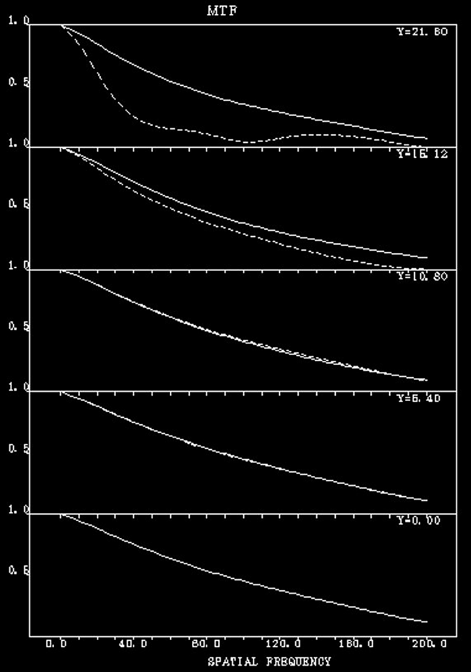 表2は周波数が横軸になっている波動光学的MTFのグラフです。下から像高y=0(中心)、25%、50%、70%、100%(最大像高)のグラフになっています。さてどうでしょう。理論的にはMTFのコントラスト値が10%有すれば解像していると判断できますので、200本/mmは像高10.8mm(50%)の領域までは解像することが分かりました。どうも「マイクロニッコールは100本/mmはおろか200本/mm以上の解像力があった」という伝説は間違いではなかったということが言えそうです。今回、設計値を用いた光学シミュレーションで「伝説」の真偽が明らかにできました。