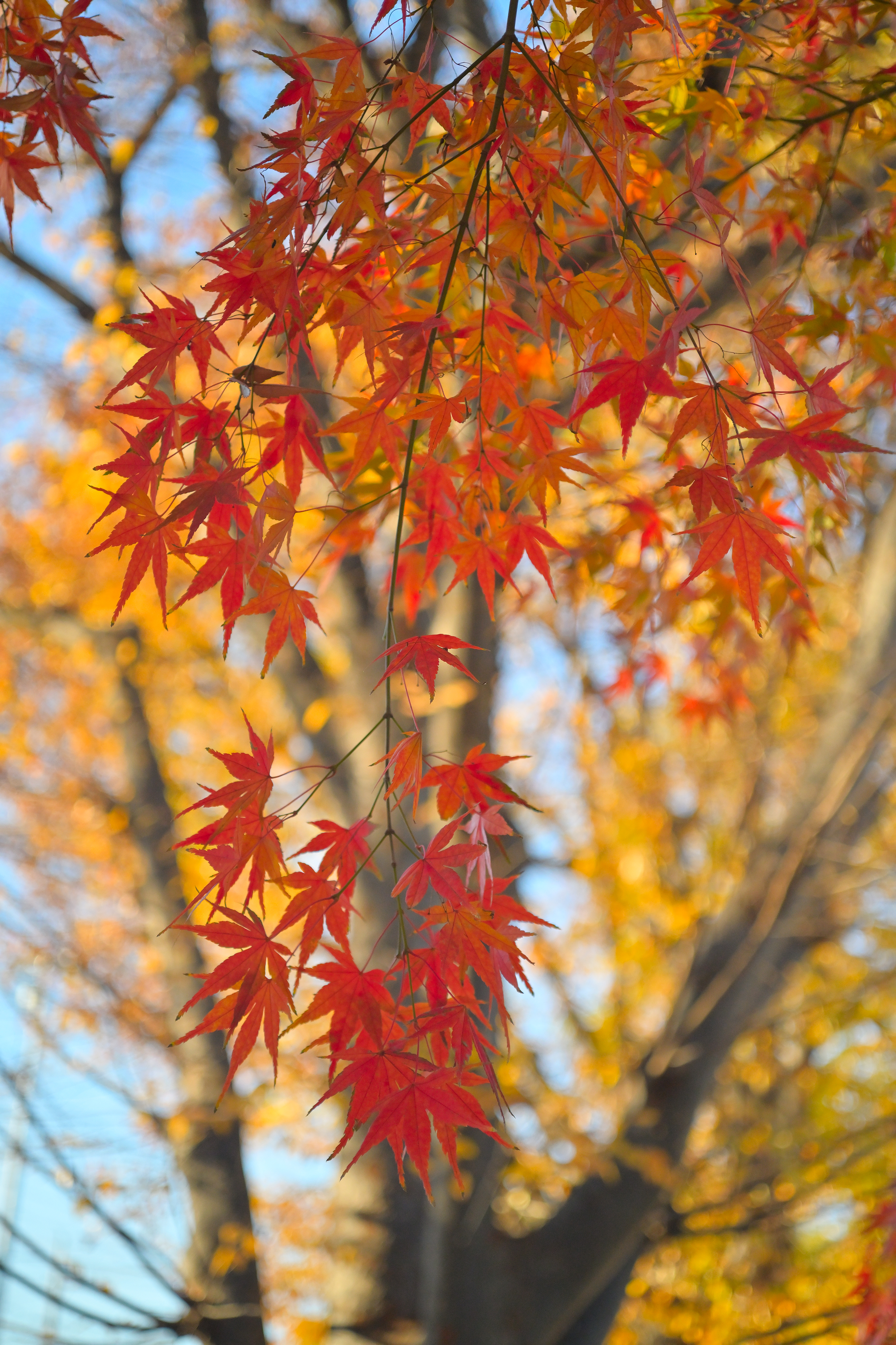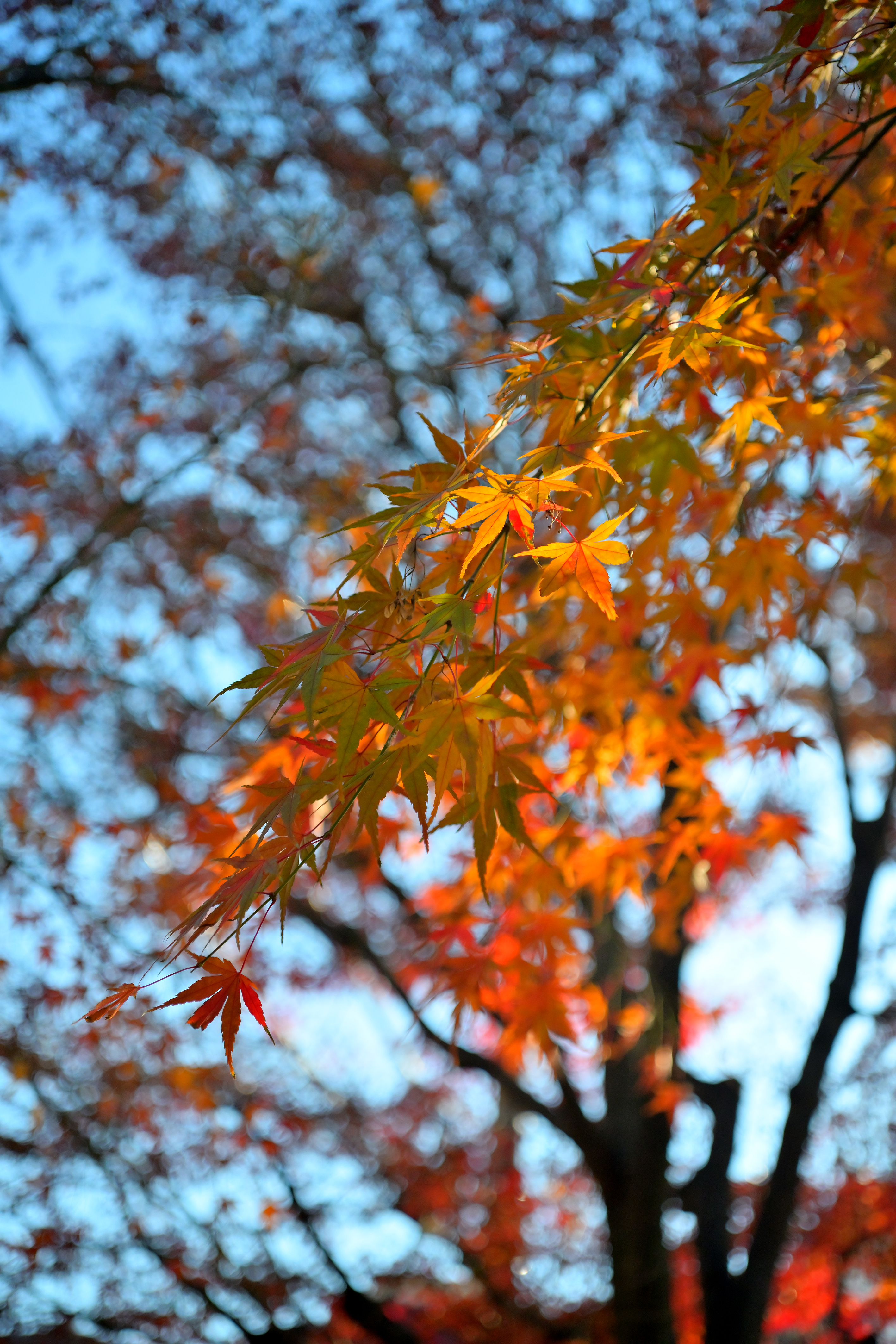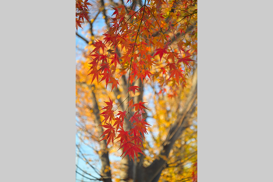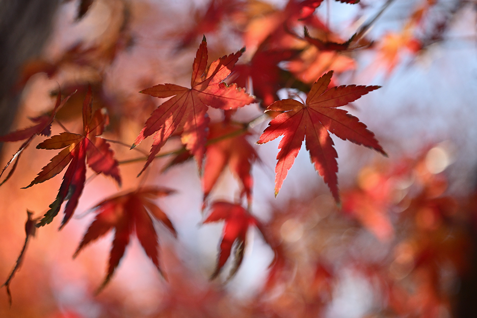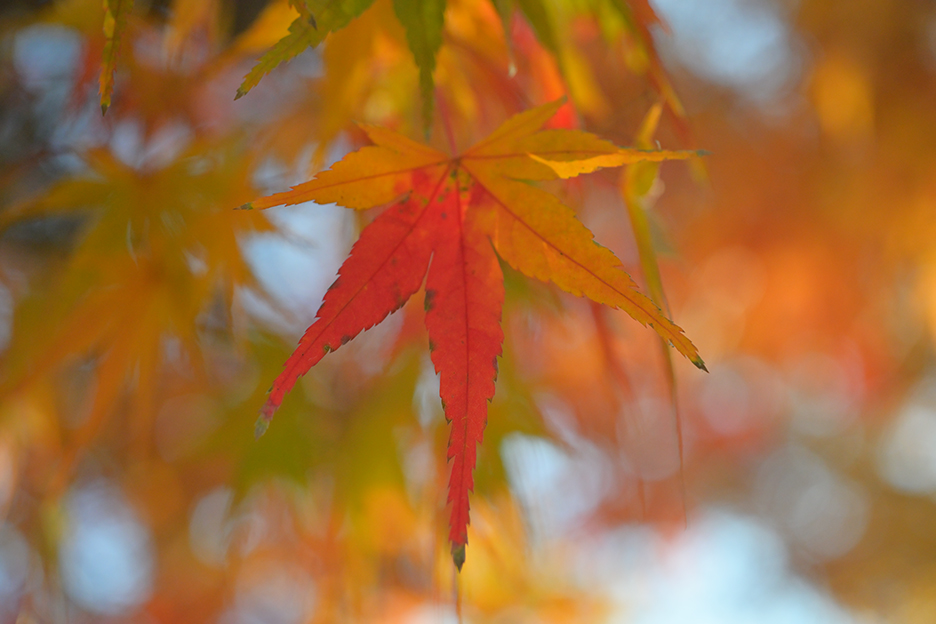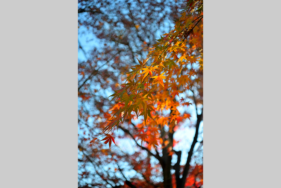 作例6は作例5より少しだけ離れた位置における作例です。勿論絞りは開放絞りのF3.5です。ピント位置は手前の紅葉です。解像力もコントラスト再現性もとても良好です。やはり作例5と同様に、この撮影距離でのボケ味は美しいとまでは言えませんが、所謂二線ボケの発生を一歩手前で堪えており、十分実用に耐えそうです。