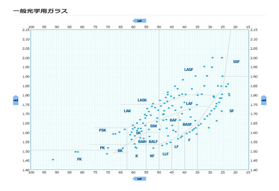 ここで問題になるのが硝材選択の自由度です。以下のグラフをご覧ください。光学ガラスには以下の様にnd-νdで表すガラスマップ図があります。縦軸がd線屈折率で横軸がアッベ数です。図の様に使用できるガラスの分布には、ある特定の傾向があります。