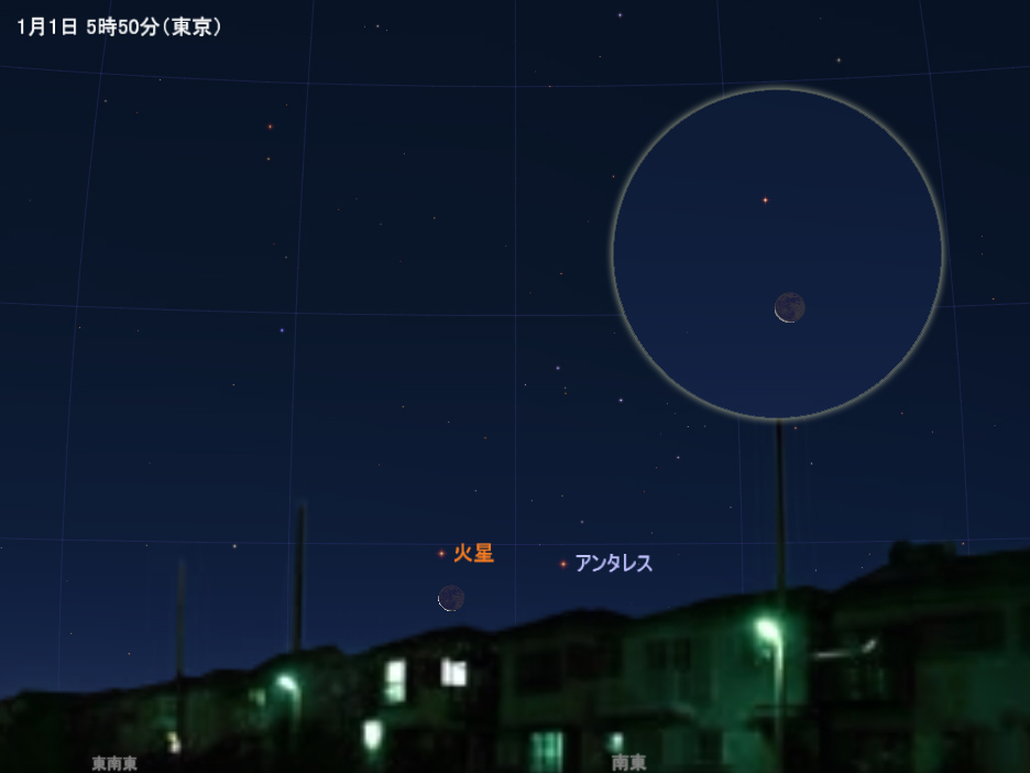 今年の場合、初日の出の約1時間前(東京、大阪ともに6時ごろ)に見える細い月と火星の大接近が、最初の天文現象です。南東の空の低いところで起こるので、見晴らしの良いところで眺めましょう。肉眼でもよく見えるので、初詣に双眼鏡を持っていく必要はありません。月と火星の右には「さそり座」の1等星アンタレスも見えます。火星とアンタレスという2つの赤い星が並ぶ光景は、新年のおめでたい感じにふさわしいですね。ちなみに初日の出は、月とアンタレスよりもう少し左寄り(東南東に近いところ)から昇ってきます。