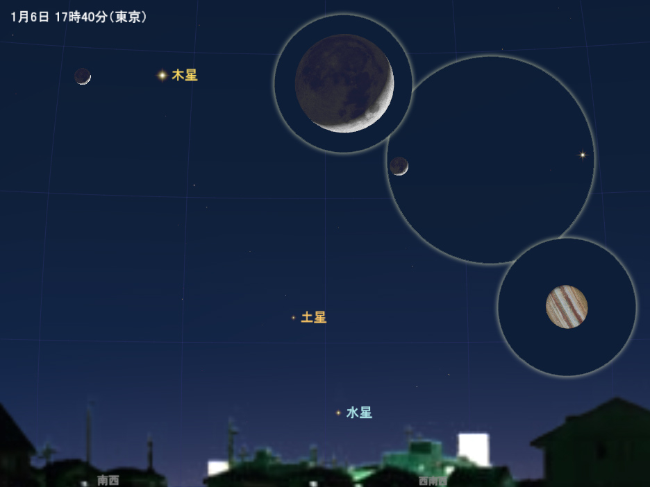 1月6日17時40分(東京における、日の入り約1時間後)の、南西の空の様子。囲み内は拡大イメージ(視野6度)、小さい円は月と木星をさらに拡大したイメージ(正立像。月と木星の拡大率は異なる)