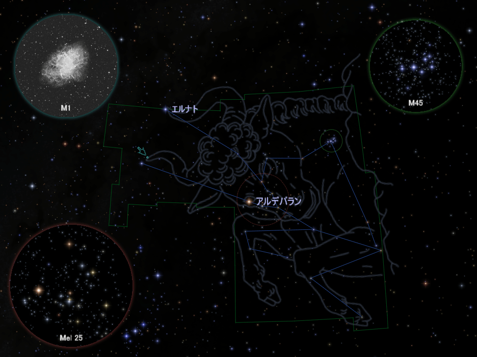 「おうし座」の目印は赤っぽく輝く1等星アルデバランで、星座の絵で牛の目にあたる位置にある星です。アルデバランの周辺に広がるV字型の星の配列が牛の顔、そこから東(図では左)に2本の角が伸びています。足や体の後ろ半分はあまり目立たないので、爛々と輝く立派な目や長い角に注目してみましょう。