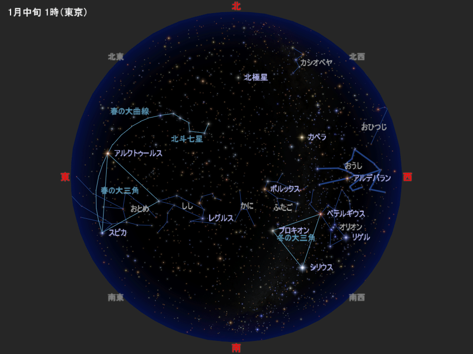 図は1月中旬の深夜1時ごろの星空です。2月中旬の深夜23時ごろ、3月中旬の夜21時ごろにも、この星空と同じ星の配置になります(月が見えることもあります)。