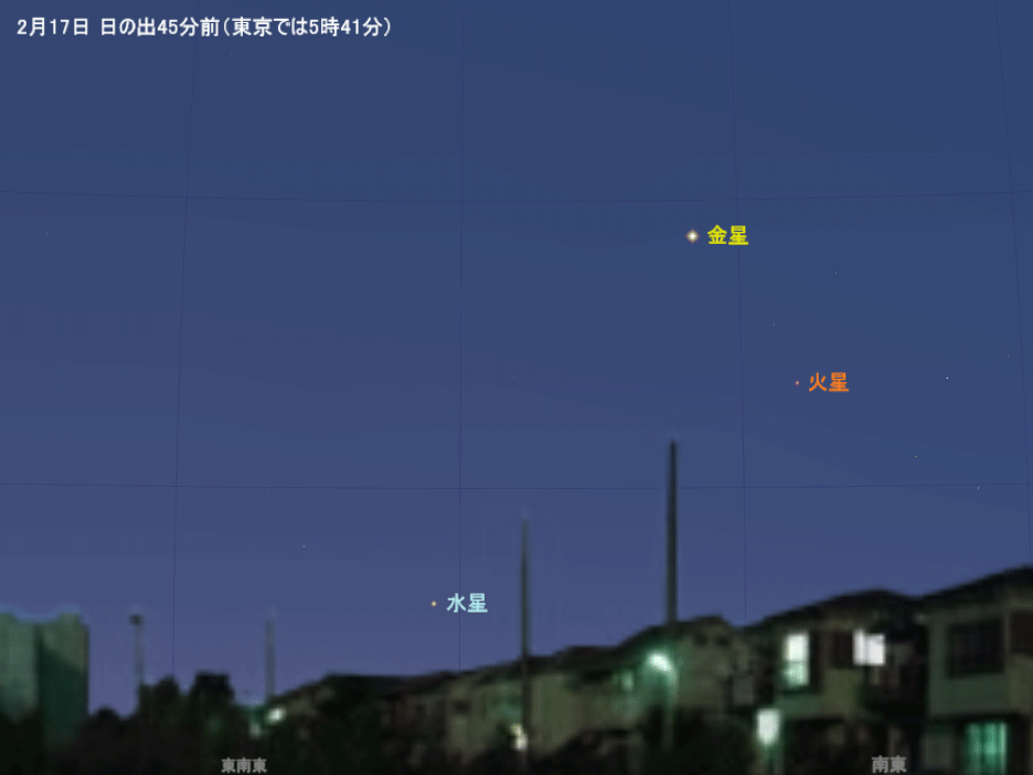さらに、金星と火星の左下、地平線に近いところには水星も見えます。火星よりも明るく、位置がわかれば肉眼でもよく見えますが、夜明けが近づくにつれて空が白むことや建物に隠されることなどの理由で見つけにくいかもしれません。金星、火星との位置関係を手がかりにして探してみましょう。スマートフォンの星図アプリなどを使うと位置がわかりやすくなります。また、双眼鏡を使うのもお勧めです。日の出の1時間前から30分前くらいまでが見やすいでしょう。これより早いと水星が低すぎ、これより遅いと空が明るくなりすぎます。