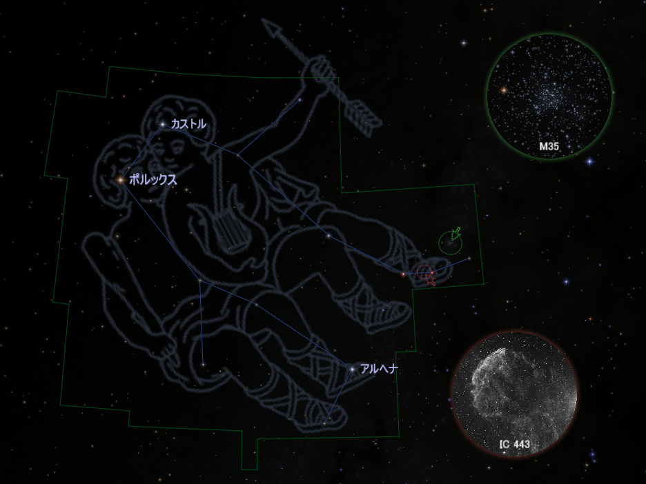 カストルの足の先にはM35のほかに、「くらげ星雲」という愛称で呼ばれる天体(カタログ番号:IC 443)もあります。重い星が一生の最期に大爆発を起こし、広がった物質が見える超新星残骸の一つです。