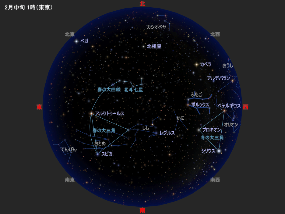 図は2月中旬の深夜1時ごろの星空です。3月中旬の深夜23時ごろ、4月中旬の夜21時ごろにも、この星空と同じ星の配置になります(月が見えることもあります)。