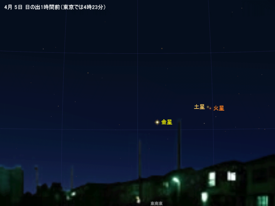 この3時間後くらいから東の空が明るくなりはじめ、今月ご紹介した明け方の惑星たちが次々と昇ってきます。新年度のスタートは早起きして、明るい惑星たちと共に迎えてみてはいかがでしょうか。