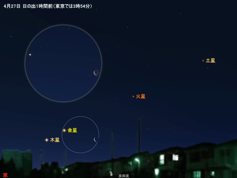 日の出1時間前(東京で4時ごろ)の高度は10度未満と低く見づらいですが、明るいので、建物などに隠されていなければ見つけられるはずです。金星の左下と見当をつけて眺めてみましょう。低いため、天体望遠鏡での観察には向いていません。