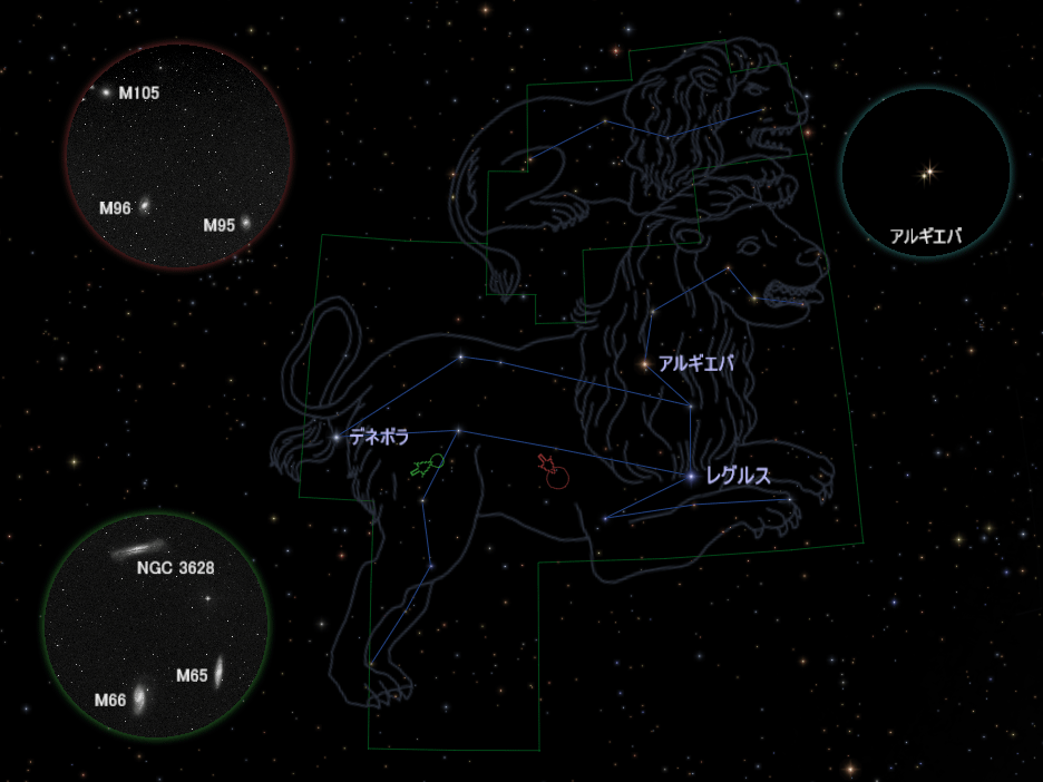 ライオンの後ろ足の付け根あたりには「M65、66、NGC 3628」という3つの銀河が集まっています(MやNGCはカタログ名)。また、お腹のあたりにも「M95、96、105」という3つの銀河が集まっています。いずれも9~10等級の明るさで、空の条件の良いところでは口径10cm程度の望遠鏡で見ることができます。