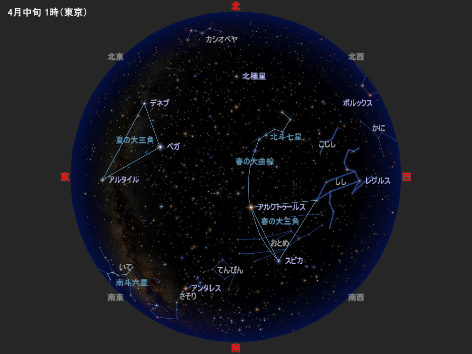図は4月中旬の深夜1時ごろの星空です。5月中旬の深夜23時ごろ、6月中旬の夜21時ごろにも、この星空と同じ星の配置になります(月が見えることもあります)。