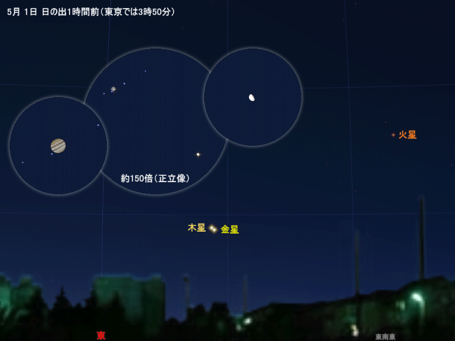日の出1時間前(東京で3時30分ごろ)の高度は約20度とやや低めですが、肉眼で簡単に見つけられます。とくに、月末に木星と大接近する光景が見ものです。早起きして観察してみましょう。25日には月齢24の月も加わった3天体の共演が楽しめます。