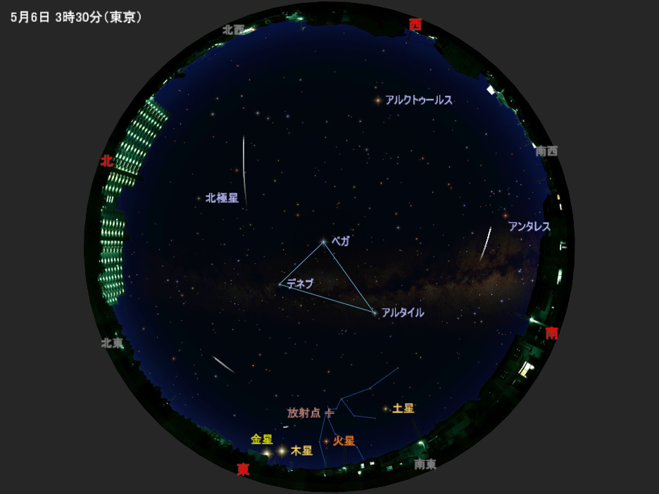 みずがめ座η流星群(η(エータ、イータ)は星の符号)は、毎年ゴールデンウィークの終盤に活動がピークとなる流星群です。「みずがめ座」のη星付近にある放射点(流れ星が飛ぶ中心の方向)を中心として四方八方に流れ星が飛ぶように見えることから、このような名前で呼ばれています。
