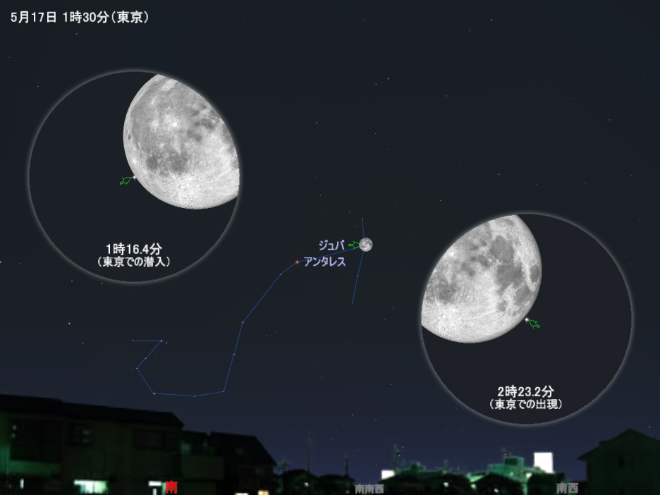 この夜に月に隠されるのは、「さそり座」のジュバという星です。「さそり座」の赤っぽい1等星アンタレスの右にあり、さそりの顔の位置で輝いています。