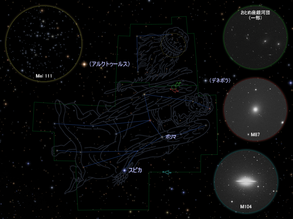 「おとめ座」と「かみのけ座」の境界あたりには銀河が多数集まっています。星がたくさん集まった天体を「星団」と呼ぶのと同様に、銀河の集団は「銀河団」と呼び、この「おとめ座銀河団」の場合には銀河が1000個近くも含まれています。