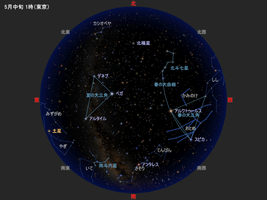 図は5月中旬の深夜1時ごろの星空です。6月中旬の深夜23時ごろ、7月中旬の夜21時ごろにも、この星空と同じ星の配置になります(惑星は少し動きます/月が見えることもあります)。