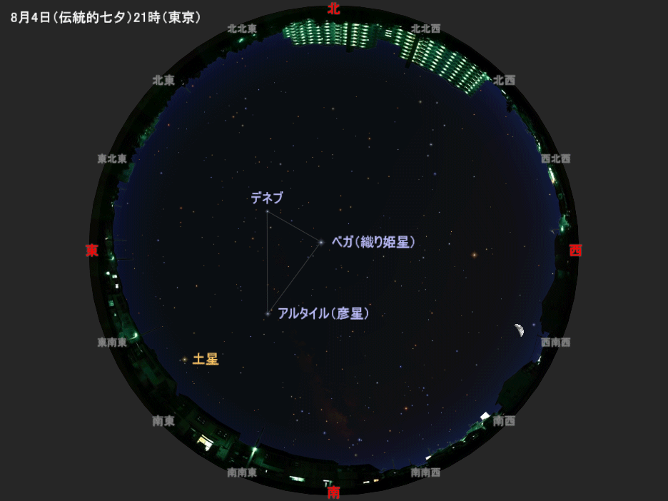 7月7日は七夕でしたが、これは古くからの行事なので、旧暦の7月7日に行われることもあります。そこで旧暦7月7日(※)を「伝統的七夕」と呼んで、天文行事として楽しんだり祝ったりすることも広く行われています。伝統的七夕の日は毎年日付が変わり、今年の場合は8月4日です。