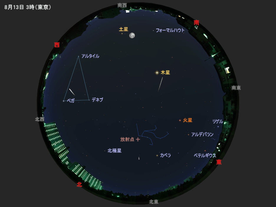 | 13日(土) | ペルセウス座流星群の活動がピーク(「今月の星さがし」で解説) |