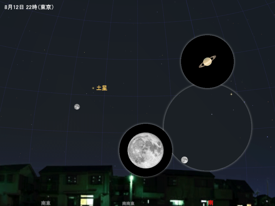 月と土星(8月12日)、木星(15~16日)、火星(20日)の接近の様子(場所の設定は東京)。大きい円は拡大イメージ(視野7度)、小さい円はさらに拡大のイメージ(正立像、月と惑星で拡大率は異なる)