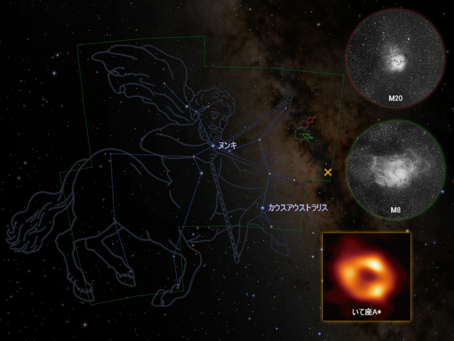天の川銀河の中心には、太陽の約400万倍もの質量を持つ超大質量ブラックホール「いて座A*(エースター)」が存在すると考えられています。今年5月にそのブラックホールが作る「シャドウ(影)」の画像(色は擬似的なものです)が公開され、話題となりました。いて座を眺めるときには、天の川銀河全体や、天文学研究の最先端にも想像を巡らせてみてください。