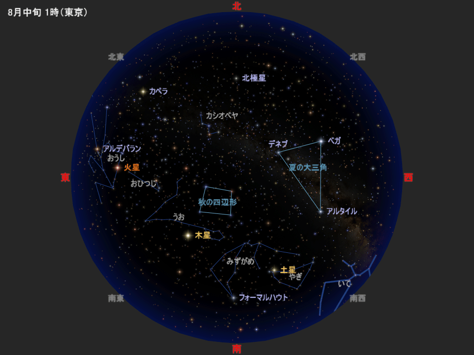 図は8月中旬の深夜1時ごろの星空です。9月中旬の深夜23時ごろ、10月中旬の夜21時ごろにも、この星空と同じ星の配置になります(惑星は少し動きます/月が見えることもあります)。