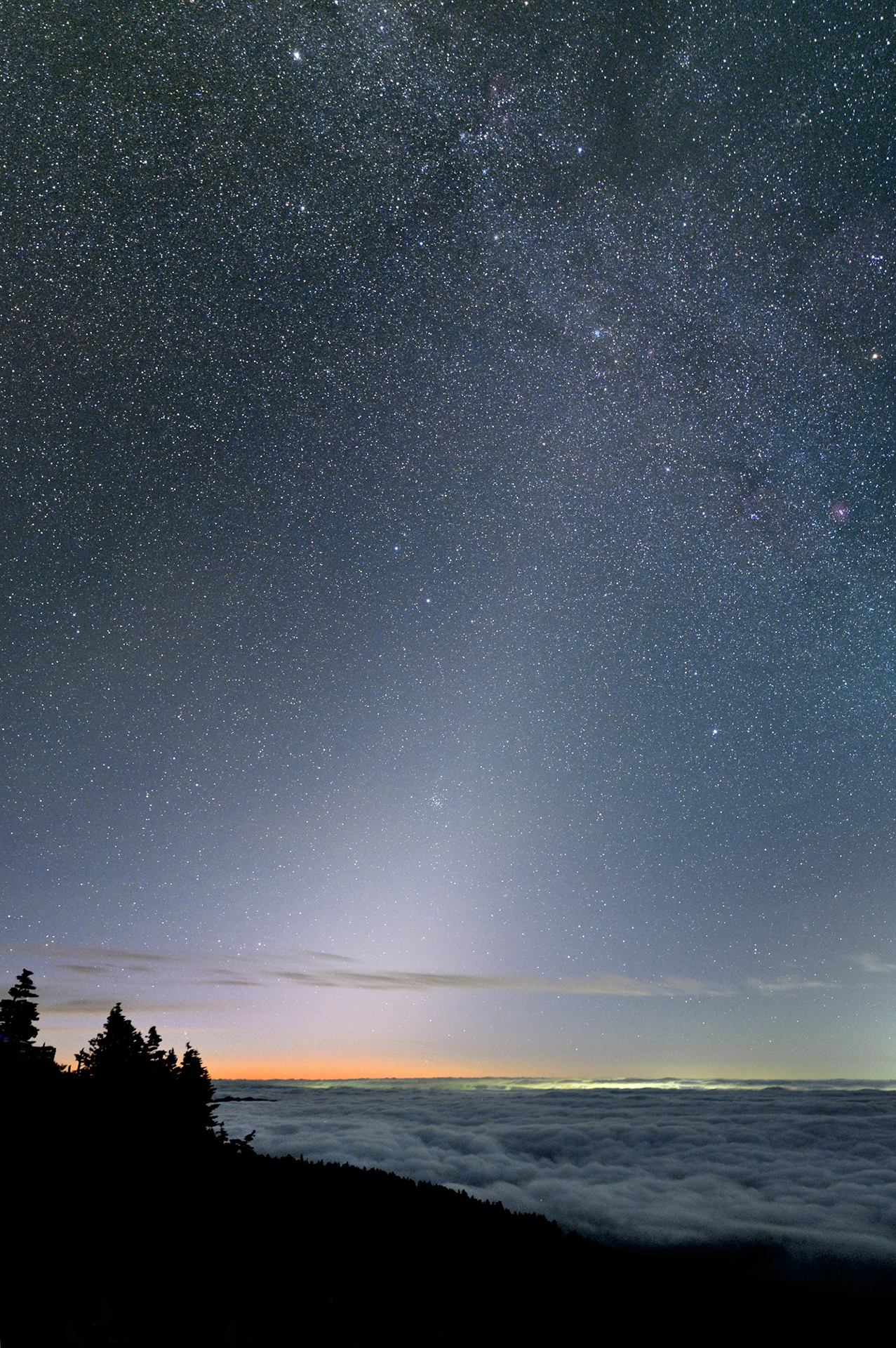 渋峠は秋から初冬にかけて、雲海の発生頻度が高くなります。薄明開始直後に雲海から立ち昇る黄道光は、心を揺さぶる神秘の光景です。