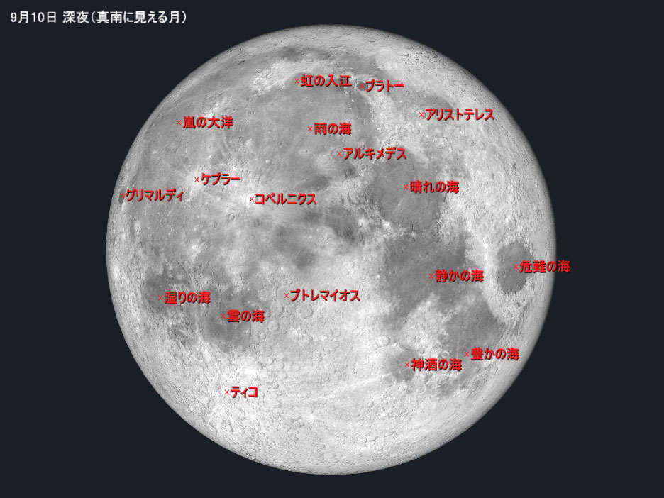十五夜の月は必ずしも満月になるとは限らないのですが、今年は10日が満月でもあり、日付が一致します。10日の宵のころに東の空に昇ってくる満月の名月は、真夜中に南の空の高いところに見え、11日の明け方に沈むまで一晩中、空を明るく照らします。