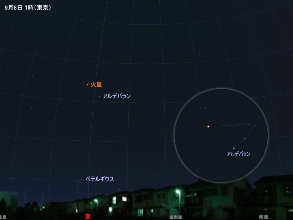 火星は現在「おうし座」に位置し、牛の眼にあたる位置に輝く1等星アルデバランと並んでいます。アルデバランも赤っぽい色なので、2つの星が色や明るさを競い合っているかのようです。アルデバランの付近にV字形に並ぶ星々が牛の顔にあたりますが、4~8日ごろは牛の両眼が赤いようなイメージになるでしょう。
