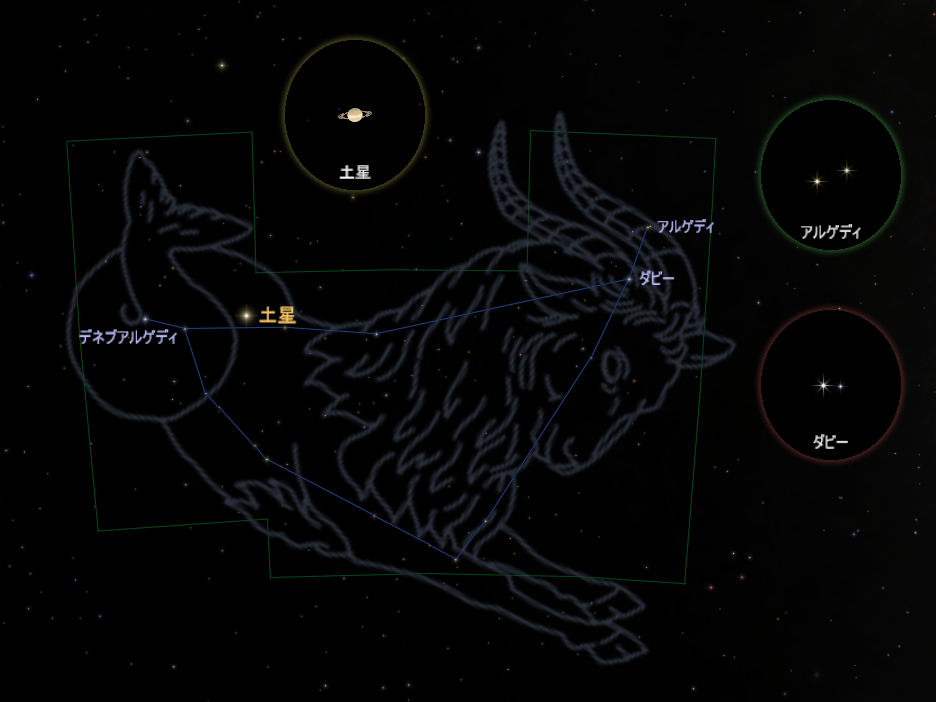 「やぎ座」は一番明るい星でも3等星なので、街中で見つけるのは少し難しいのですが、今年は土星が目印になるので位置の見当はつけやすいでしょう。南西に見える「わし座」の1等星アルタイルと、南東に輝く「みなみのうお座」の1等星フォーマルハウトの間あたり、という見つけ方もできます。