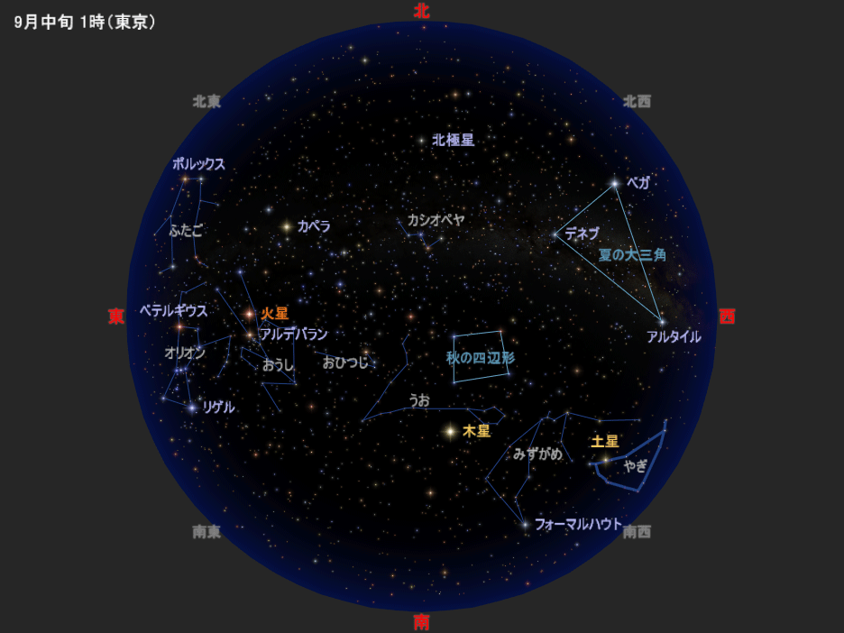 図は9月中旬の深夜1時ごろの星空です。10月中旬の深夜23時ごろ、11月中旬の夜21時ごろにも、この星空と同じ星の配置になります(惑星は少し動きます/月が見えることもあります)。