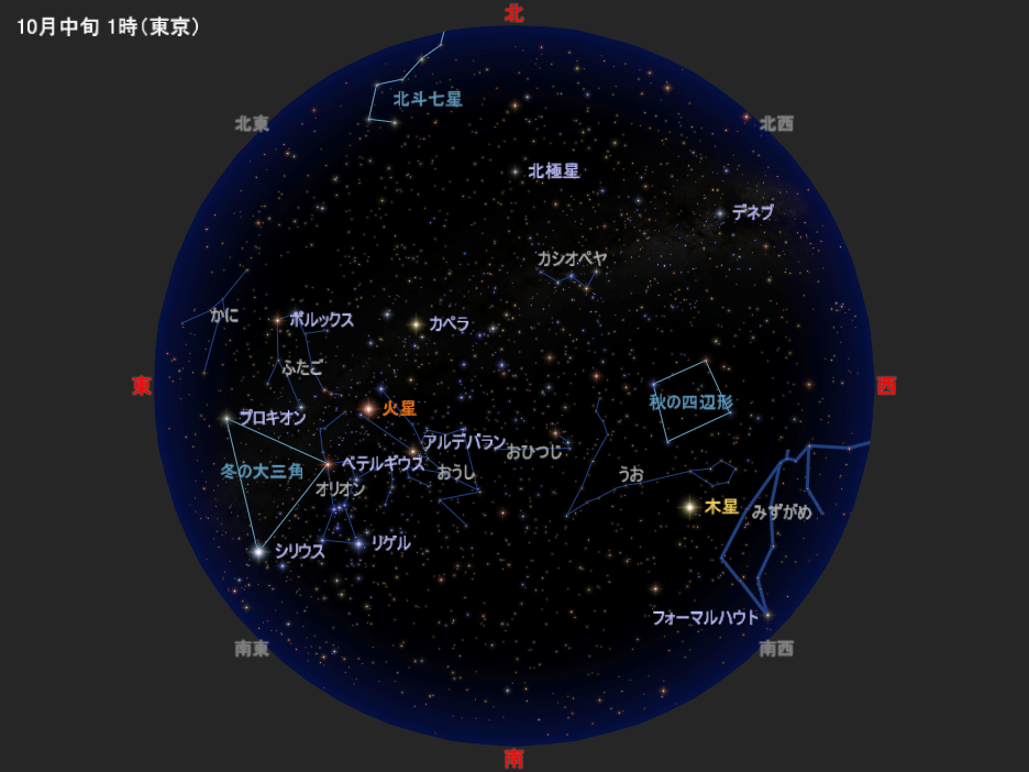 図は10月中旬の深夜1時ごろの星空です。11月中旬の深夜23時ごろ、12月中旬の夜21時ごろにも、この星空と同じ星の配置になります(惑星は少し動きます/月が見えることもあります)。